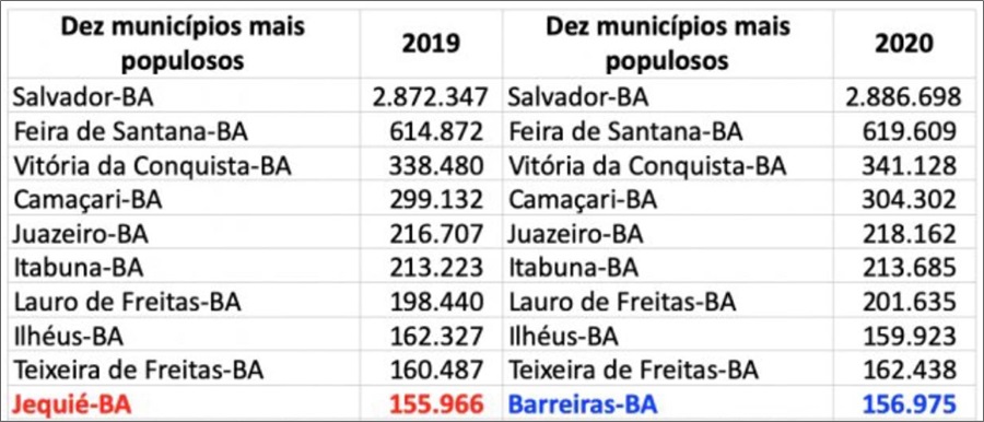 No extremo sul da Bahia, apenas Teixeira de Freitas, figura entre as dez mais populosas.