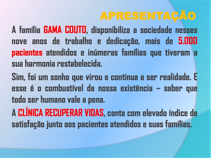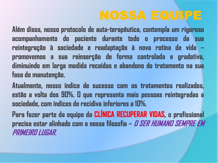 Nossa reportagem esteve no local, nesta quinta-feira, 31, onde pode constatar os trabalhos rigorosos através de grandes profissionais, que contemplam os pacientes e os cuidados para reintegração na sociedade e readaptação às novas rotinas de suas vidas. Telefones para contatos: 73-3261-2891 ou 73-99989-1992. Veja abaixo o portfólio da Clínica Recuperar Vidas: