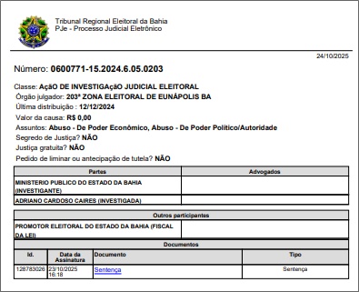 O advogado Jota Batista acaba de conquistar uma decisão histórica na Justiça Eleitoral de Eunápolis. O vereador Adriano Cardoso foi absolvido de todas as acusações em uma Ação de Investigação Judicial Eleitoral (AIJE) movida pelo Ministério Público do Estado da Bahia, que o acusava de suposto abuso de poder político e econômico nas eleições municipais de 2024.