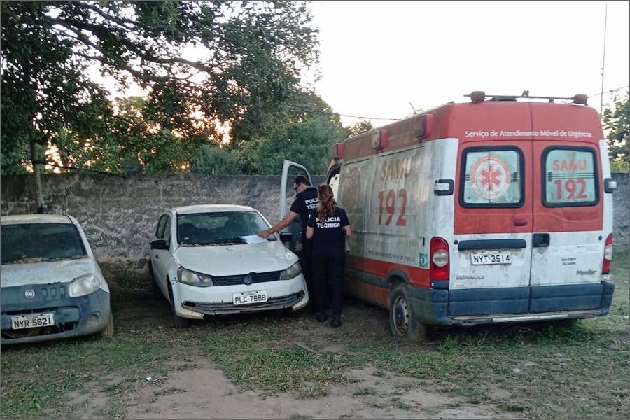 Dentre esses veículos estão uma ambulância da SAMU, de placa NYT-3515, e um Gol branco de placa PLC-7688, ambos parados no pátio e enferrujados, mas que aparecem na lista de manutenção no decorrer deste ano.