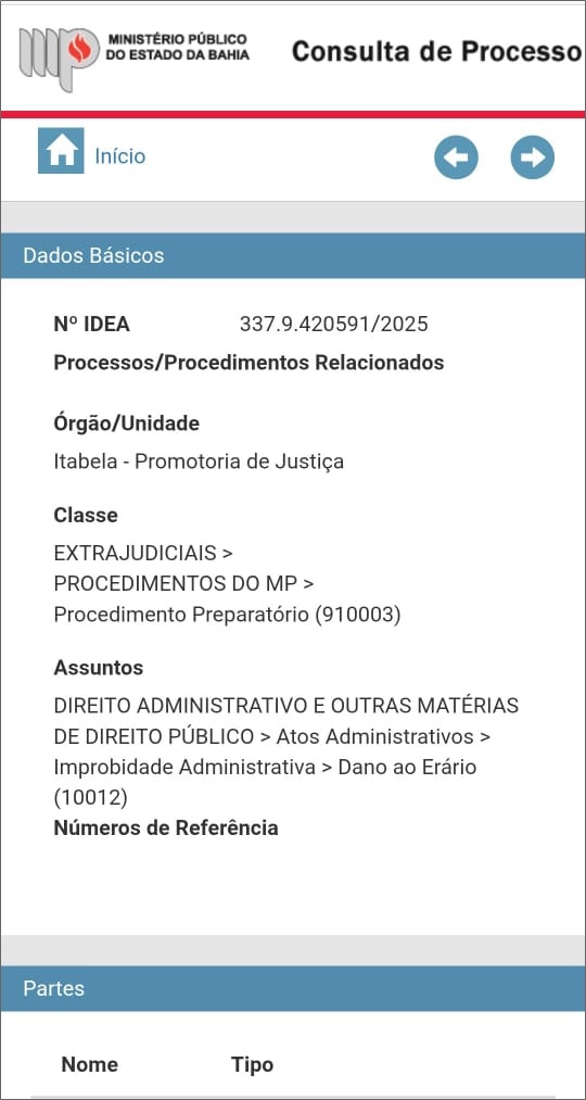 O Processo de Número 337.9.420581/2025, que corria em segredo de justiça, encontra-se aberto.