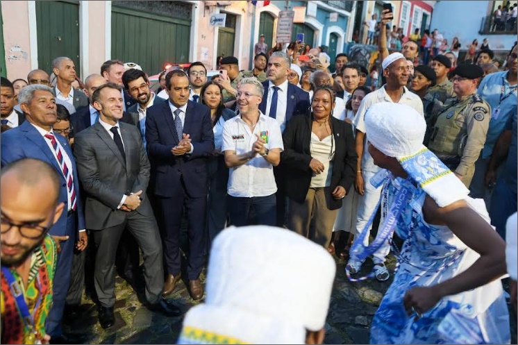 Visita ao Pelourinho - Macron foi recebido no aeroporto pelo governador Jerônimo Rodrigues. Em seguida, fez um passeio turístico pelo Pelourinho e recebeu carinho pelas ruas do Centro Histórico. Durante o trajeto, a Banda Feminina Didá, o Bloco Afro Olodum e os Filhos de Gandhy mostraram a força e beleza da cultura baiana. Em seguida, Macron se dirigiu ao MAM-BA para participar da abertura do festival.