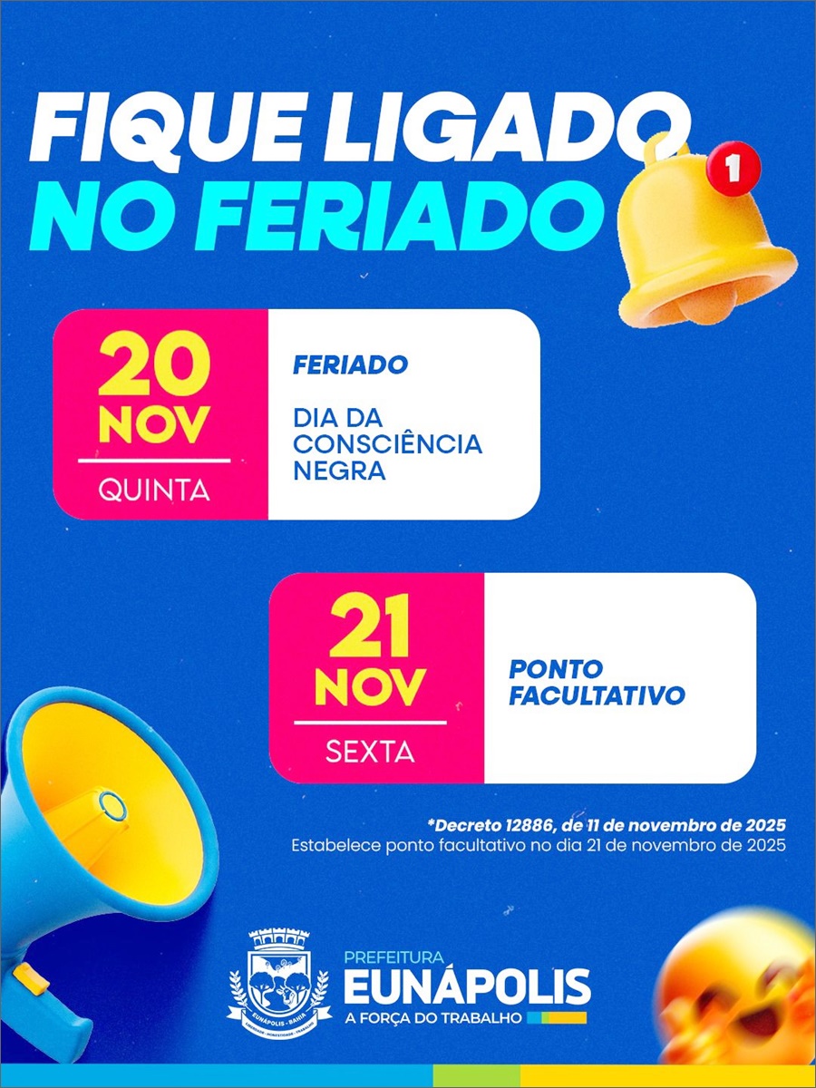 A Prefeitura de Eunápolis decretou ponto facultativo na próxima sexta-feira, 21 de novembro, em razão do feriado nacional do Dia da Consciência Negra, celebrado na quinta-feira, 20 de novembro. A medida foi formalizada por meio do Decreto nº 12.507/2025, publicado no Diário Oficial do Município em 14 de novembro de 2025.