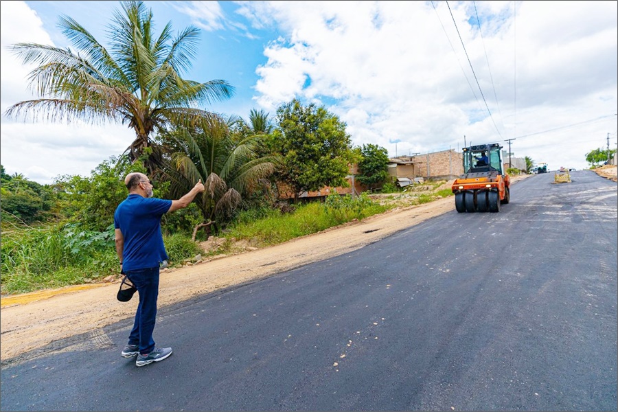 O prefeito Robério Oliveira vistoriou, nesta sexta-feira (21), o andamento das obras na Rua Adolpho Xavier, via estratégica que conecta os bairros Dinah Borges e Alto da Boa Vista. A etapa de macrodrenagem foi concluída na quinta-feira (20), feriado, permitindo o avanço imediato para a preparação da base e o início da pavimentação asfáltica, que seguiu noite adentro.