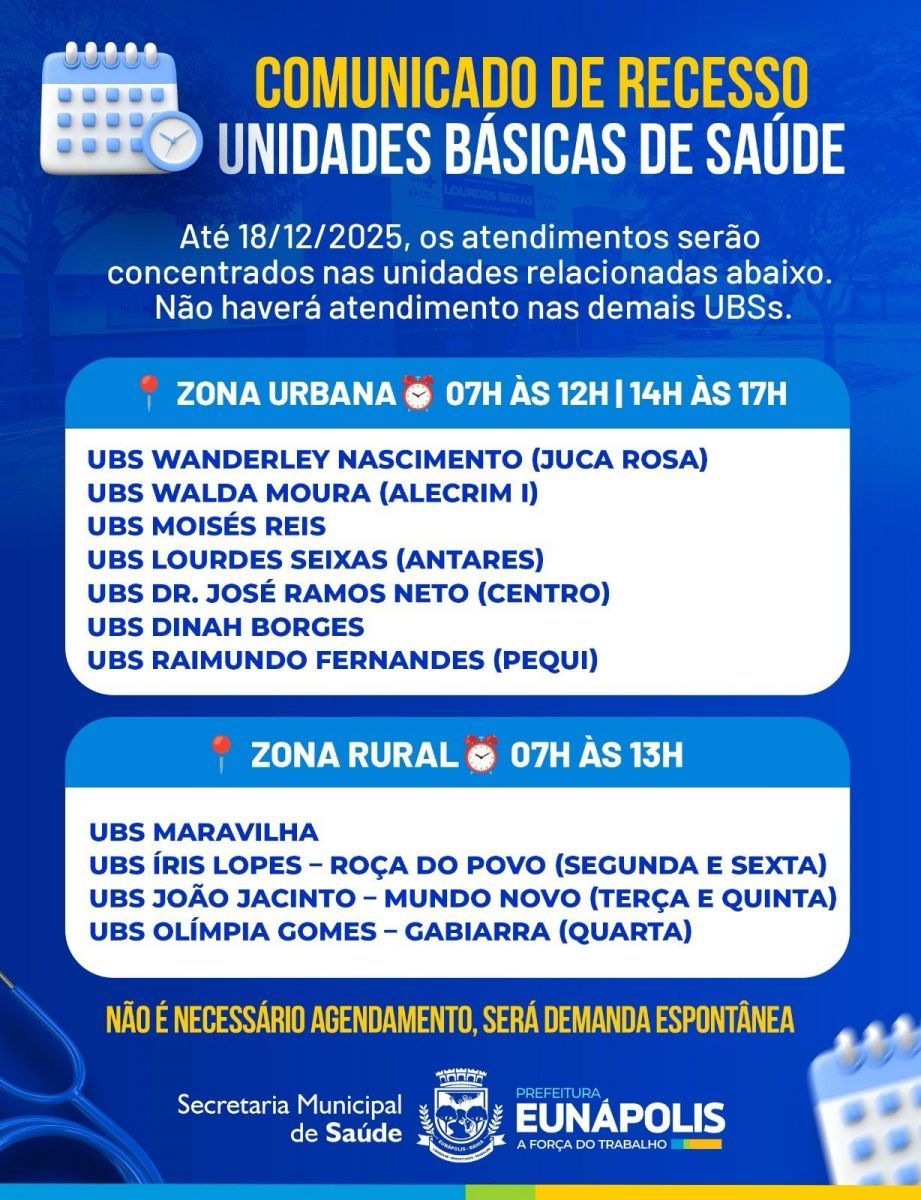 A Prefeitura de Eunápolis, por meio da Secretaria Municipal de Saúde, divulgou o cronograma especial de funcionamento das Unidades Básicas de Saúde (UBS) para o período de 8 a 18 de dezembro de 2025, além de informar o recesso dos serviços de Saúde Mental (CAPS) durante o fim de ano.