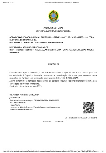 Nesta quarta-feira (10), o juiz eleitoral Wilson Nunes da Silva Júnior reconsiderou o encaminhamento e determinou a suspensão da recontagem, informando que o recurso já foi contrarrazoado e está pronto para ser remetido à instância superior. Com isso, os autos serão enviados ao Tribunal Regional Eleitoral da Bahia (TRE-BA), que deverá apreciar o recurso interposto pelo vereador.