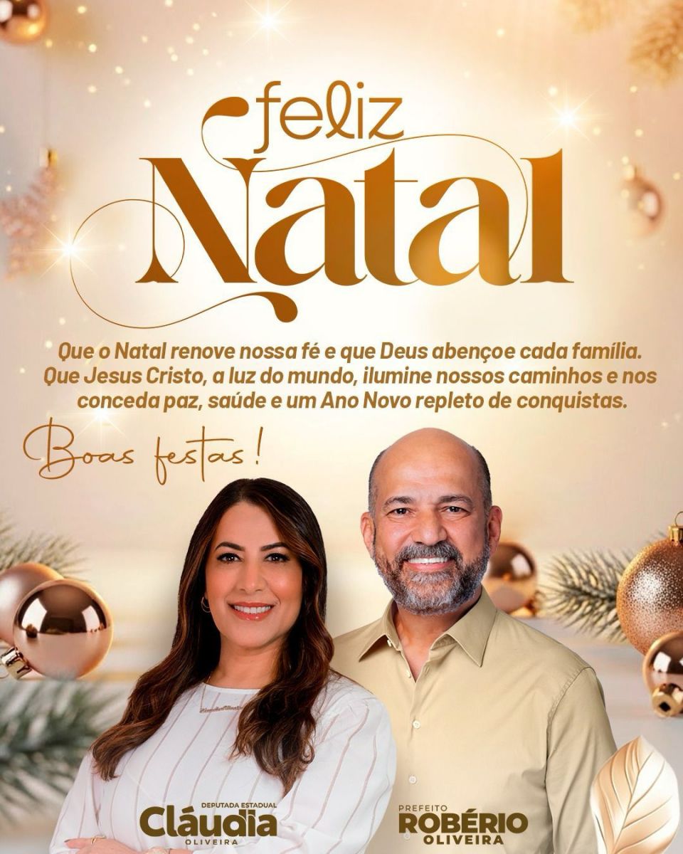 O prefeito Robério Oliveira e a deputada estadual Cláudia divulgam Mensagem de Boas Festas para as famílias de Eunápolis e de toda região, desejando que o Natal renove nossa fé e que Deus abençoe cada família. Que Jesus Cristo, a Luz do mundo ilumine os nossos caminhos.