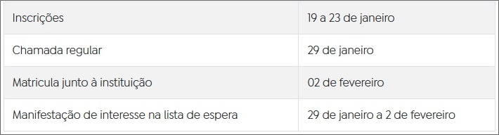 As vagas serão preenchidas pelas instituições segundo a ordem de classificação dos candidatos e, no período de 29 de janeiro até 2 de fevereiro de 2026, o candidato que não for selecionado na chamada regular poderá manifestar interesse em participar da lista de espera.