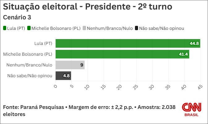 Em uma disputa contra Michelle Bolsonaro, o atual presidente alcança 44,8%, enquanto a ex-primeira-dama fica com 41,4%.