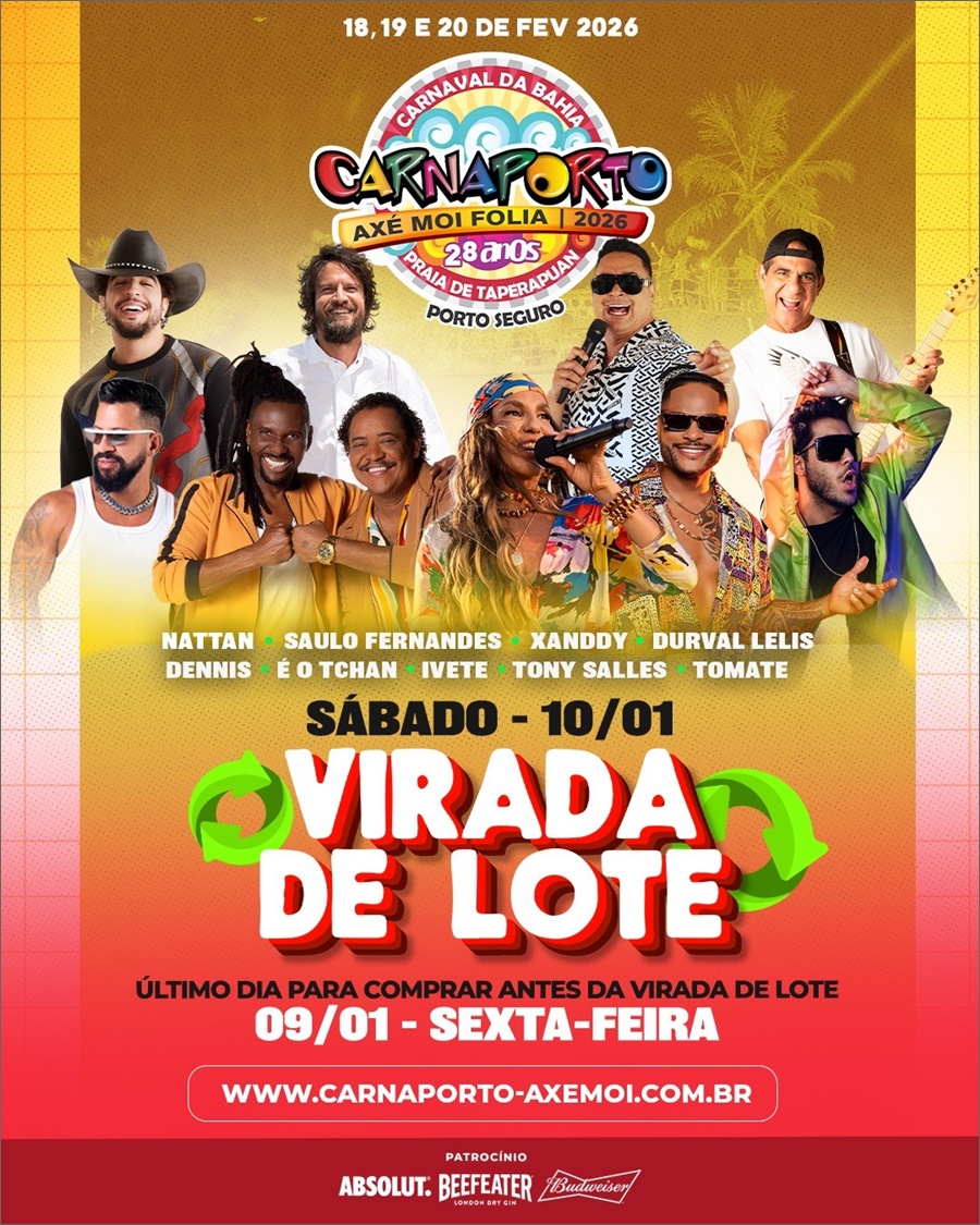 Dia 10 de janeiro acontece a quinta virada de lote do Carnaporto Axé Moi 2026. Você tem até o dia 9 de janeiro para garantir o seu no valor do lote atual.