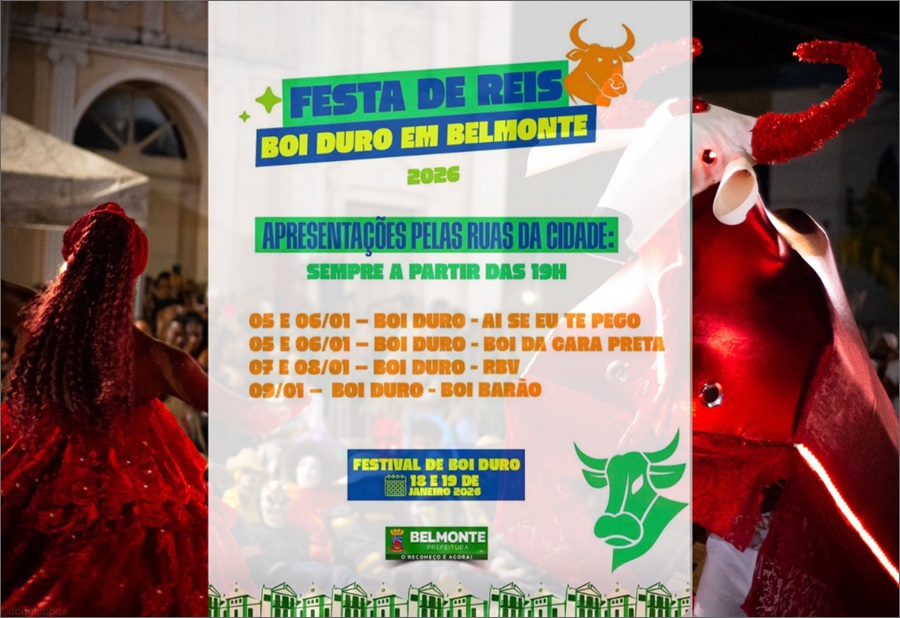 A cidade de Belmonte já respira a alegria e as cores de uma de suas mais fortes tradições culturais. A Prefeitura Municipal divulgou o calendário oficial da Festa de Reis – Boi Duro em Belmonte 2026, prometendo movimentar as ruas da cidade durante todo o mês de janeiro. O evento, que celebra o folclore local e a devoção típica do período de Reis, traz para as ruas a energia contagiante dos grupos de “Boi Duro”. As apresentações, marcadas pela percussão vibrante e pela criatividade das alegorias, terão início sempre às 19h, percorrendo as vias do município e interagindo com a comunidade.