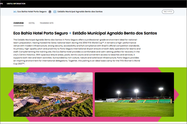 “O Eco Bahia Hotel oferece um ambiente confortável e tranquilo, perfeito para a recuperação, no Centro Histórico da cidade. Com espaçosas áreas de lazer, piscinas, quadras de tênis e acesso conveniente às praias e serviços, suporta atividades de descanso e equipe. Cercado por uma rica cultura, natureza e infraestrutura local sólida, Porto Seguro oferece ambiente inspirador para delegações internacionais. Juntos, este par é um acampamento base ideal para o Mundial Feminino da FIFA”, diz o site oficial dos centros de treinamento da Fifa.