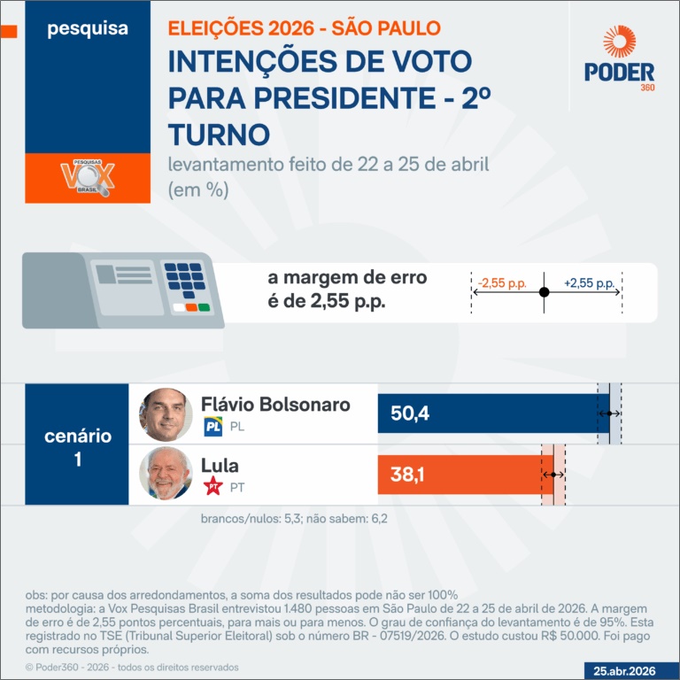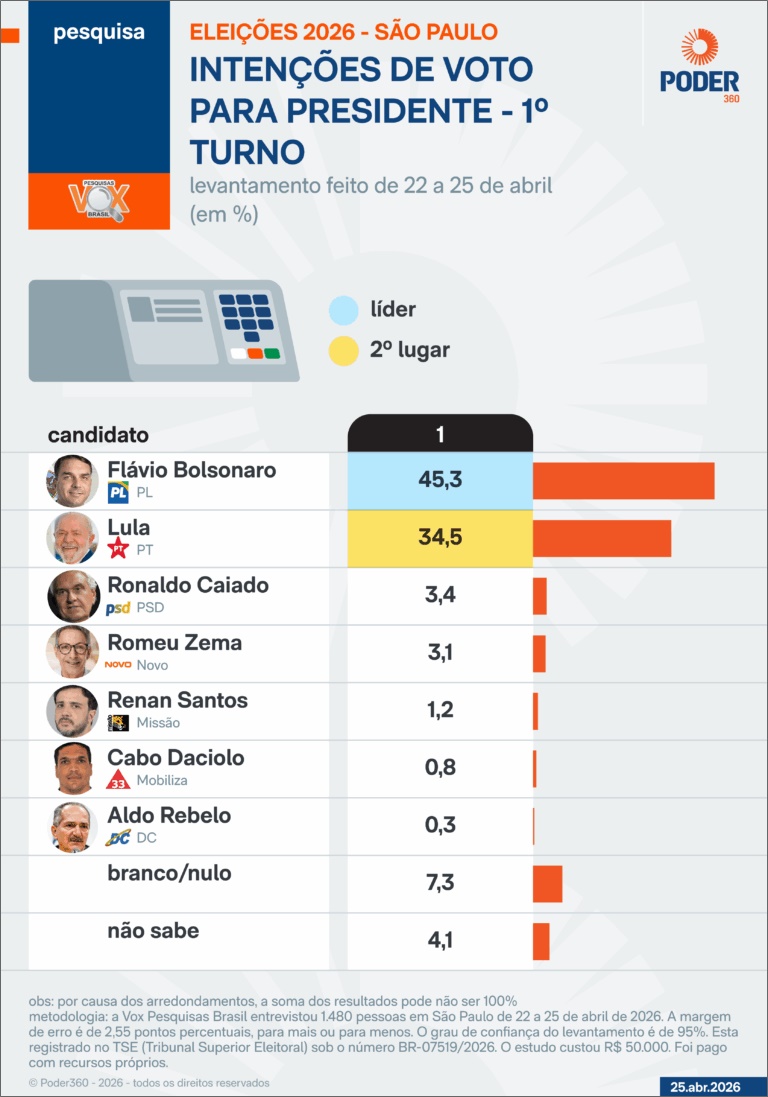 Levantamento da Vox Brasil Pesquisas feito de 22 a 25 de abril entre os eleitores de São Paulo mostra que o senador Flávio