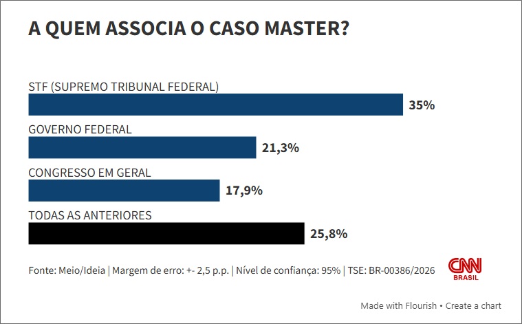Pesquisa Meio/Ideia divulgada nesta quarta-feira (11) mostra que o STF (Supremo Tribunal Federal) é a instituição mais associada ao caso Master pelos brasileiros que têm conhecimento do escândalo.