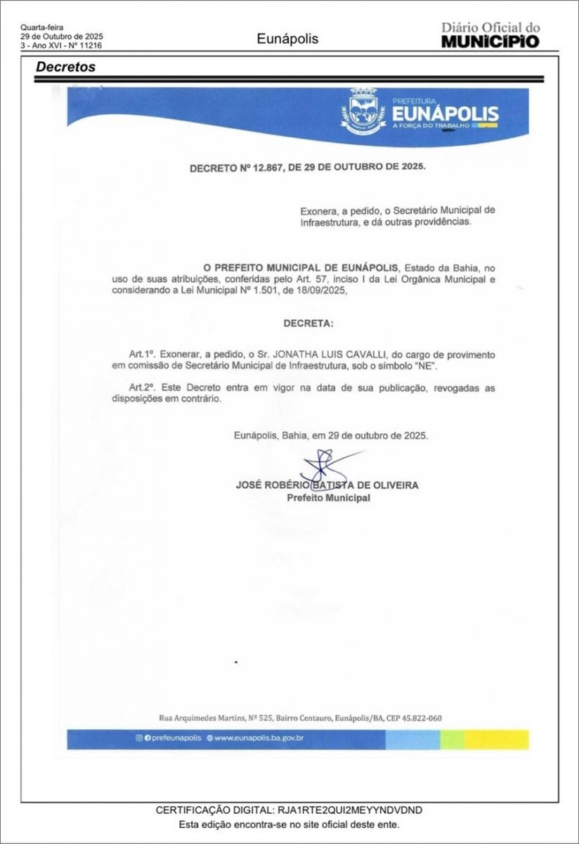 O decreto de sua exoneração a pedido foi assinado pelo prefeito Robério Oliveira com data de 29 de outubro, depois de 10 meses ocupando a pasta.