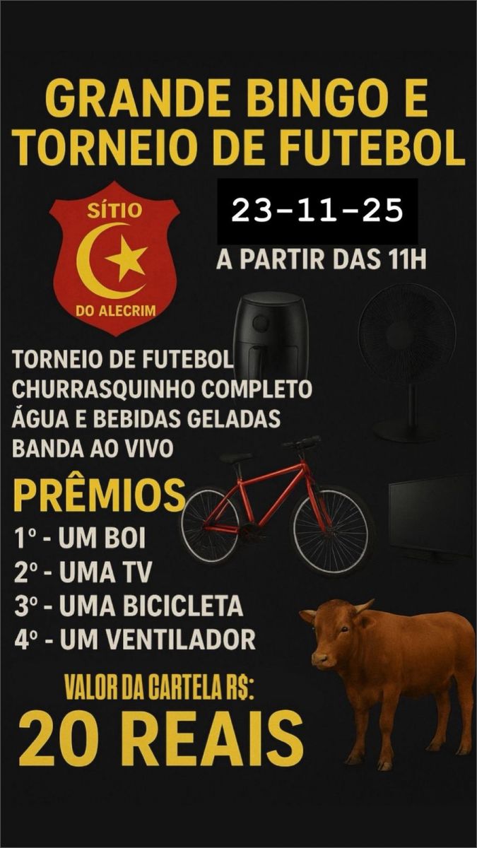 Os prêmios que serão sorteados: um boi, uma TV, uma bicicleta e um ventilador. Valor da cartela: apenas R$ 20 reais.