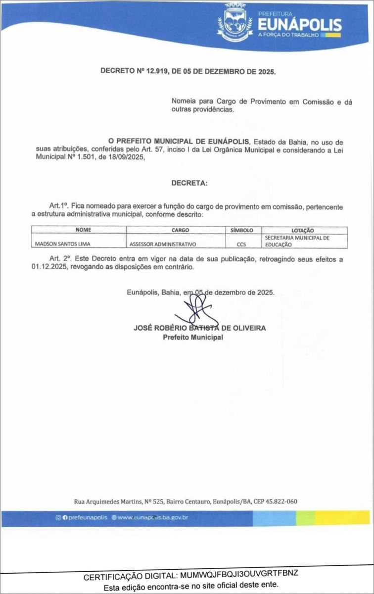Para surpresa de todos e todas, não é que apareceu uma publicação no Diário Oficial com data recente de uma nomeação sua como assessor administrativo, lotado na Secretaria de Educação de Eunápolis.