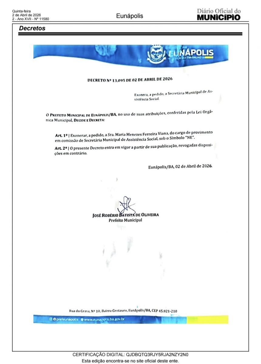 Foi publicado no Diário Oficial do Município, no fim da tarde desta quinta-feira, 02, a exoneração da Secretária de Ação Social do Município de Eunápolis.