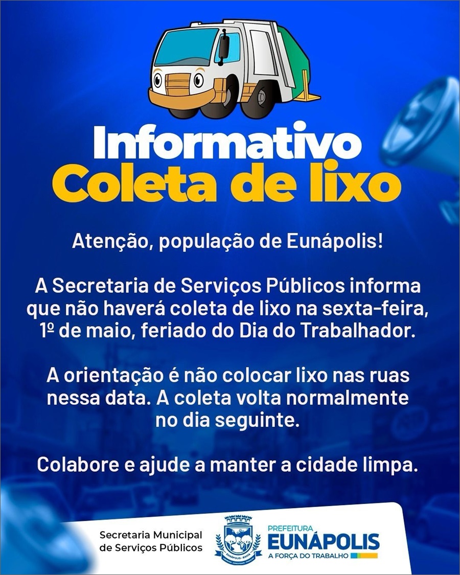A Prefeitura de Eunápolis, por meio da Secretaria Municipal de Serviços Públicos, informa que não haverá coleta de lixo na sexta-feira, 1º de maio, em razão do feriado do Dia do Trabalhador.