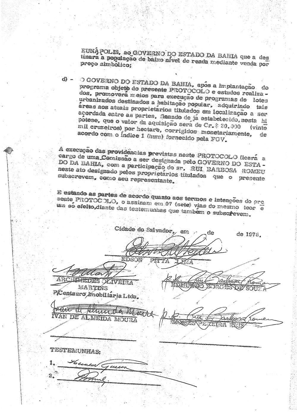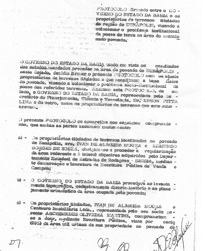 Os proprietários se comprometeram na época a doar, mediante Escritura Pública, as áreas de Eunápolis, ao Governo do Estado da Bahia que destinaria à população de baixo nível de renda mediante venda por preço simbólico.