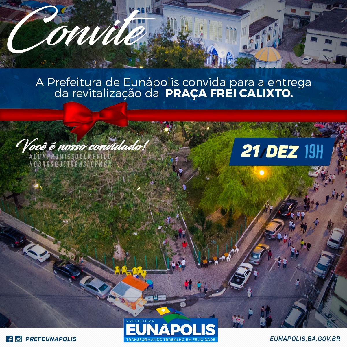 "Natal é tempo de encontro e integração, e com nossas praças requalificadas e decoradas, nossas comunidades terão espaços públicos dignos e agradáveis para confraternizarem neste fim de ano. Durante todo o ano trabalhamos dia e noite para melhorar a qualidade de vida da população eunapolitana, concluindo 2018 com mais oferta de lazer, esporte, cultura e integração, entregando duas lindas praças. Quero convidar toda população para prestigiar essa entrega", convidou o prefeito Robério Oliveira.