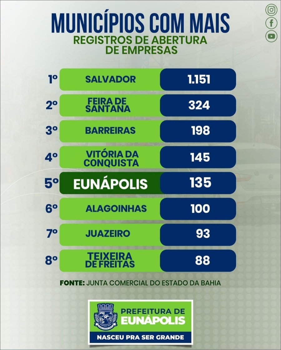 Eunápolis conquistou o quinto lugar no ranking das cidades baianas que mais abriram empresas em outubro de 2022, comprovando a ascensão do município eunapolitano perante o cenário de desenvolvimento econômico estadual, resultado do investimento da gestão na desburocratização da abertura de novos negócios.