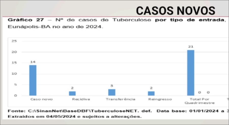 A título de ilustração, até o dia 04 de maio o município registrou 21 pessoas em tratamento, sendo 14 casos novos; dois reincidentes, ou seja, acometidos novamente pela doença; três transferências, que são pacientes de outros municípios que se mudaram para Eunápolis; e dois reingressos que são pacientes que abandonaram o tratamento e retornaram em busca de cura.