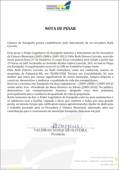 Nesta quarta-feira (01), estamos noticiando com profundo pesar, o falecimento da ex-vereadora Félix Ruth Esteves, conhecida como Ruth Contadora. A notícia chocou a todos. Ruth era uma pessoa querida por todos. Ela deixa um legado significativo para o município de Eunápolis, tanto na sua vida pessoal quanto na sua trajetória política.