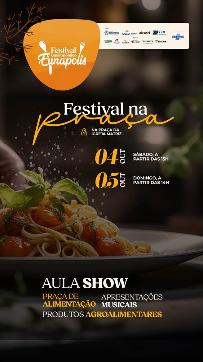 Com realização do Sebrae e Câmara de Dirigentes Lojistas de Eunápolis (CDL), o 6º Festival Gastronômico de Eunápolis conta com a correalização da Prefeitura Municipal, Abrasel e Senac, reunindo esforços para movimentar e fortalecer o setor da gastronomia na cidade, com o estímulo à visitação aos espaços por meio dos eventos de ativação.