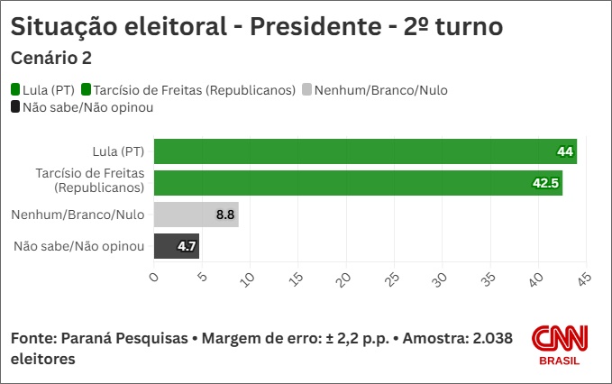 Já na segunda simulação, contra Tarcísio de Freitas, Lula tem 44% e o governador de São Paulo, 42,5%.