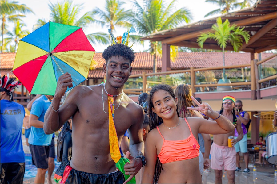Aliás, a fantasia está entre os itens recomendados aos viajantes durante a reserva. Cabe também à equipe de lazer oferecer aquele toque especial, com pinturas de rosto ao gosto do folião. “Quem vem pela primeira vez ou já conhece o nosso Carnaval fica encantado com a criatividade e a alegria dos nossos shows e atrações”, diz o coordenador de lazer do resort, João Santos.