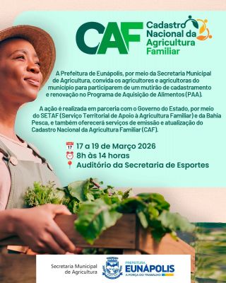A Prefeitura de Eunápolis, por meio da Secretaria Municipal de Agricultura, convida os agricultores e agricultoras do município para participarem de um mutirão de cadastramento e renovação no Programa de Aquisição de Alimentos (PAA), que será realizado de 17 a 19 de março de 2026, das 8h às 14h. A ação acontecerá no auditório da Secretaria de Esportes, localizado na Av. Nossa Senhora dos Navegantes, S/N, no bairro Itapuã.