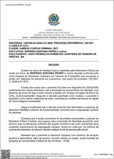 A decisão liminar, obtida com exclusividade pelo site BNews, foi proferida na última segunda-feira (9) pela Desembargadora Federal Solange Salgado da Silva, do Tribunal Região da 1ª Região (TRF1), e ocorre em meio a um cenário de guerra por território na região da Terra Indígena Comexatibá — incidente que terminou respingando em duas turistas do Rio Grande do Sul, no dia 24 de fevereiro.