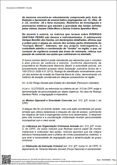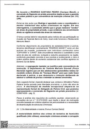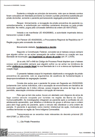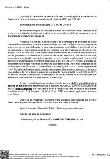 Além disso, a defesa alegou que era injusto manter o "mentor" preso enquanto os supostos atiradores (executores diretos) já tinham sido soltos pela justiça. Foi ressaltado ainda que Rodrigo é bolsista de pesquisa da Universidade Federal do Sul da Bahia (UFSB) e possui histórico de liderança diplomática, o que pesou a seu favor.