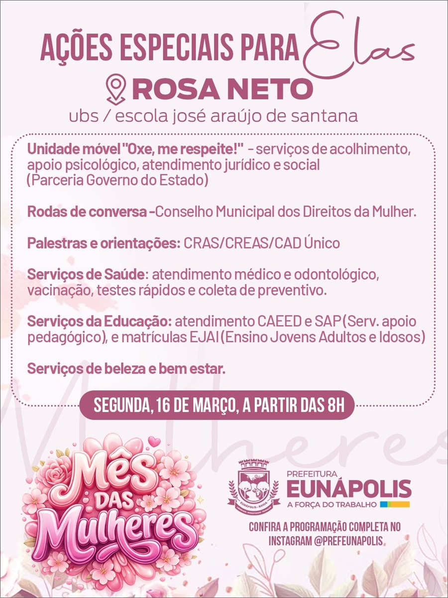 Já na segunda-feira (16), também a partir das 8h, a programação segue no bairro Rosa Neto, com Ações Especiais para Elas, realizadas na UBS Rosa Neto e na Escola José Araújo de Santana. Durante a manhã, a população terá acesso a diversos serviços gratuitos, incluindo atendimentos de saúde, vacinação, testes rápidos e coleta de preventivo, além de orientações sociais e jurídicas.