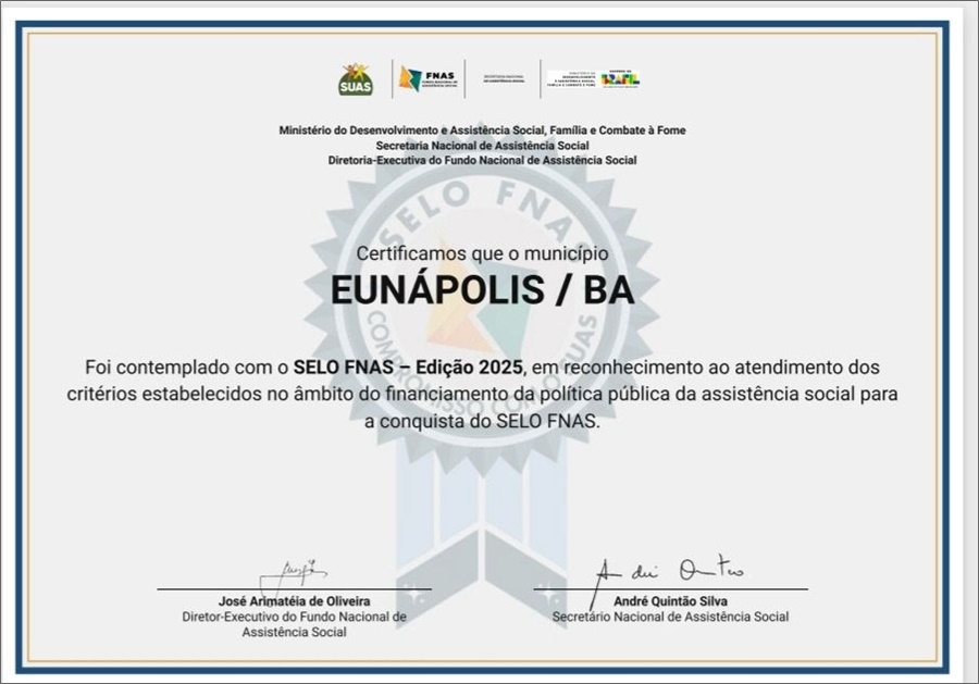 A Prefeitura de Eunápolis alcançou um importante reconhecimento nacional ao ser contemplada com o Selo de Qualidade da Gestão Financeira do SUAS – Edição 2025, concedido pelo Fundo Nacional de Assistência Social (FNAS). A certificação destaca municípios que se sobressaem na gestão responsável, transparente e eficiente dos recursos públicos destinados à assistência social.