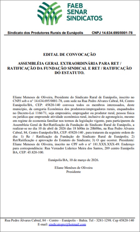 Sindicato dos Produtores Rurais de Eunápolis publica Edital de Convocação