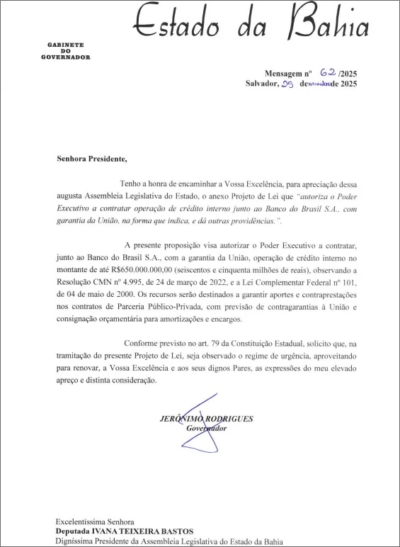 Apenas no mês de novembro, foram feitos três pedidos que, juntos, somam R$ 2,9 bilhões. O mais recente foi enviado nesta terça-feira (25) com pedido de urgência. Isso significa que os deputados terão menos tempo para avaliar a solicitação. Segundo Jerônimo Rodrigues, o valor será utilizado para garantir investimentos em parcerias Público-Privadas. O destino do dinheiro não foi detalhado.