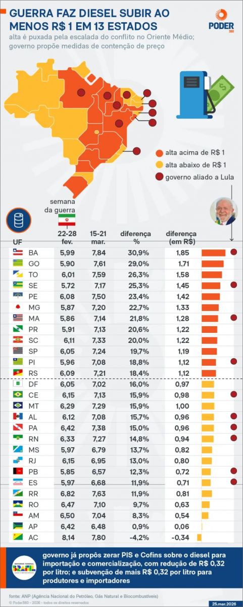 O preço do litro do diesel convencional subiu pelo menos R$ 1 em 13 Estados desde o início da guerra no Oriente Médio: Bahia, Goiás, Tocantins, Sergipe, Pernambuco, Minas Gerais, Maranhão, Paraná, Santa Catarina, São Paulo, Piauí e Rio Grande do Sul.